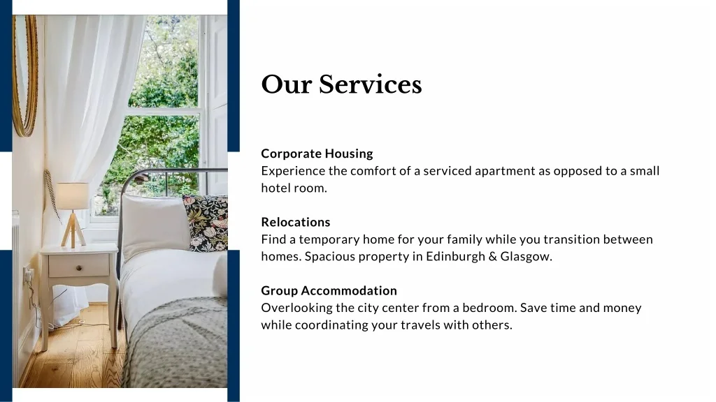 Our Services Corporate Housing Experience the comfort of a serviced apartment as opposed to a small hotel room. Relocations Find a temporary home for your family while you transition between homes. Spacious property in Edinburgh & Glasgow. Group Accommodation Overlooking the city center from a bedroom. Save time and money while coordinating your travels with others.