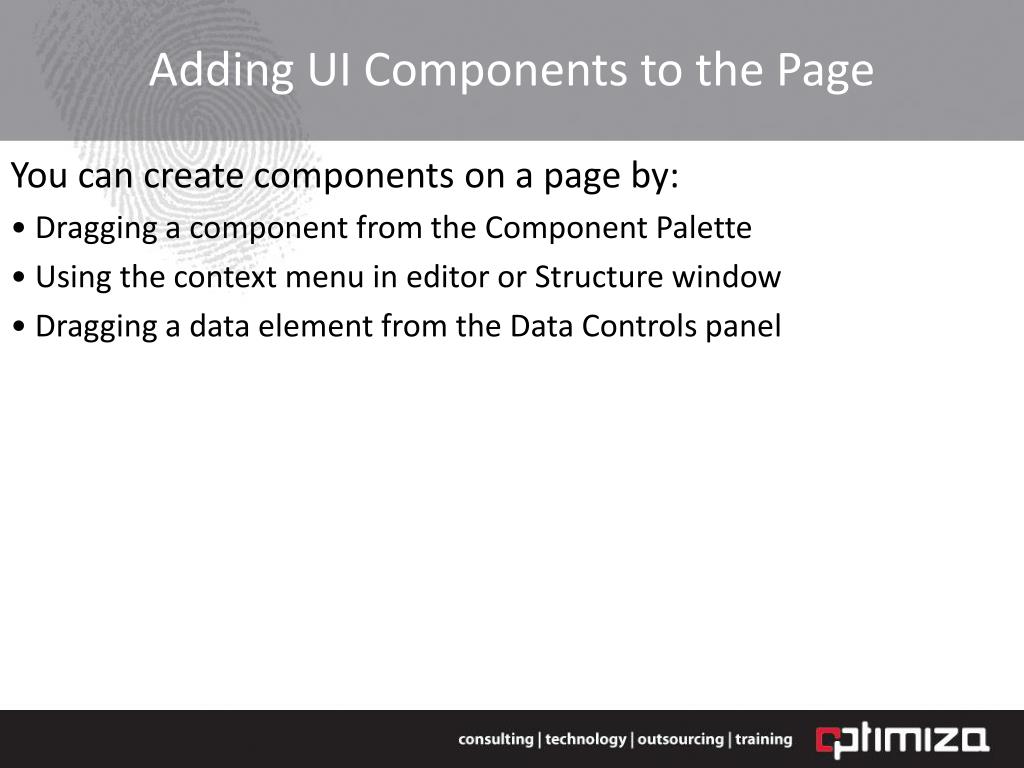 Adding UI Components to the Page You can create components on a page by: • Dragging a component from the Component Palette • Using the context menu in editor or Structure window • Dragging a data element from the Data Controls panel