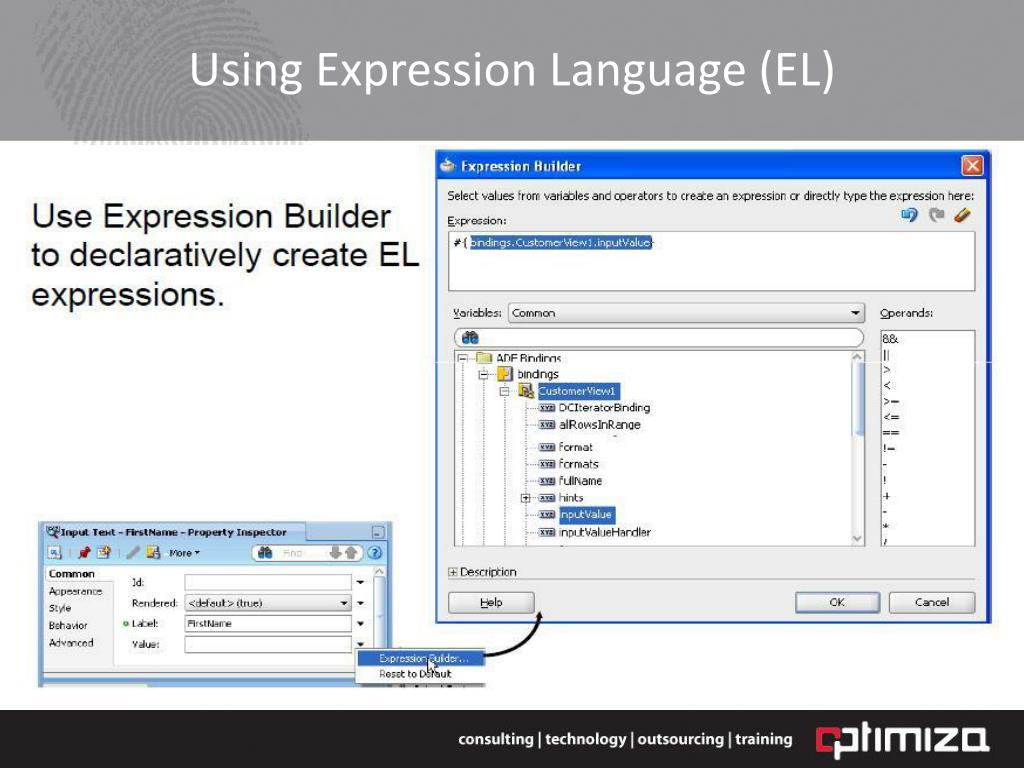 Expression Language and Bindings • Data binding expressions are written using EL. • They are evaluated at run time to determine what data to display. • ADF EL expressions typically have the form: #{bindingVariable.BindingObject.propertyName} – Example of an inputText component in a JSF page: <af:inputText value="#{bindings.Ename.inputValue}” label="#{bindings.Ename.label}” required="#{bindings.Ename.mandatory}">