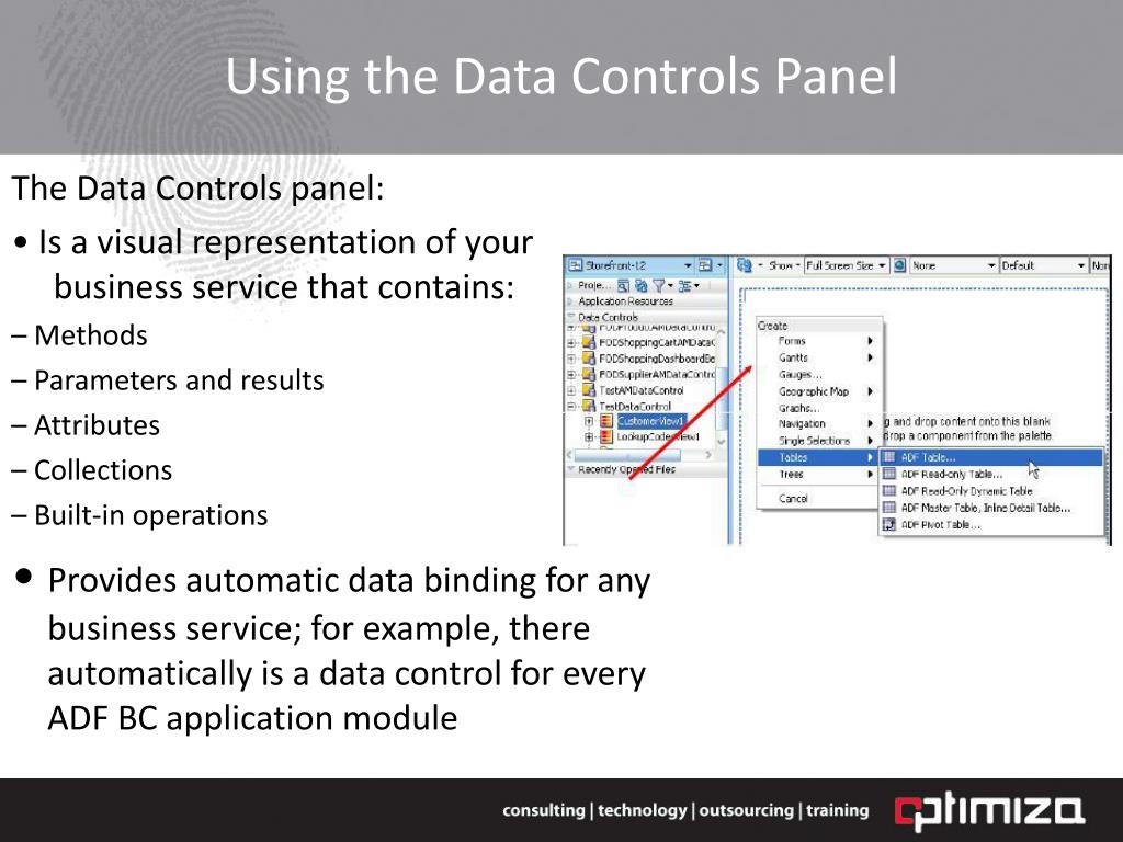 Using the Data Controls Panel The Data Controls panel: • Is a visual representation of your business service that contains: – Methods – Parameters and results – Attributes – Collections – Built-in operations • Provides automatic data binding for any business service; for example, there automatically is a data control for every ADF BC application module