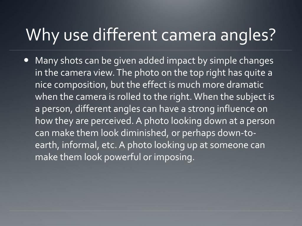 Why use different camera angles? • Many shots can be given added impact by simple changes in the camera view. The photo on the top right has quite a nice composition, but the effect is much more dramatic when the camera is rolled to the right. When the subject is a person, different angles can have a strong influence on how they are perceived. A photo looking down at a person can make them look diminished, or perhaps down-to-earth, informal, etc. A photo looking up at someone can make them look powerful or imposing.