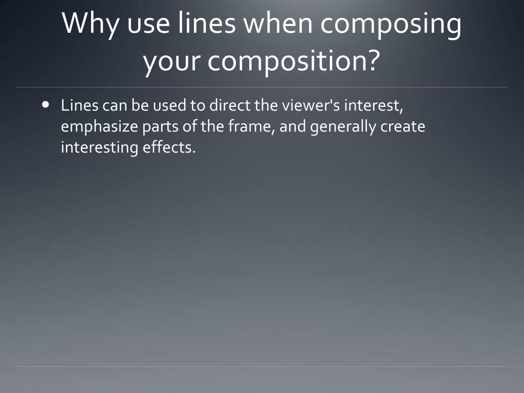 Why use lines when composing your composition? • Lines can be used to direct the viewer's interest, emphasize parts of the frame, and generally create interesting effects.