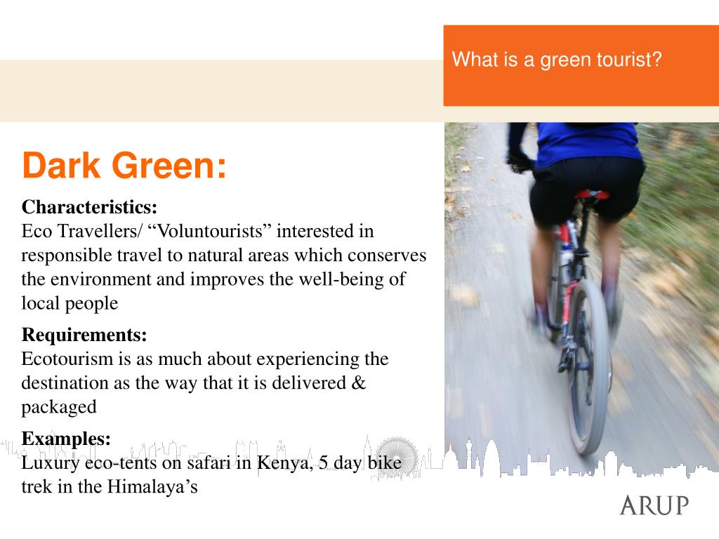 What is a green tourist? Dark Green: Characteristics: Eco Travellers/ “Voluntourists” interested in responsible travel to natural areas which conserves the environment and improves the well-being of local people Requirements: Ecotourism is as much about experiencing the destination as the way that it is delivered & packaged Examples: Luxury eco-tents on safari in Kenya, 5 day bike trek in the Himalaya’s
