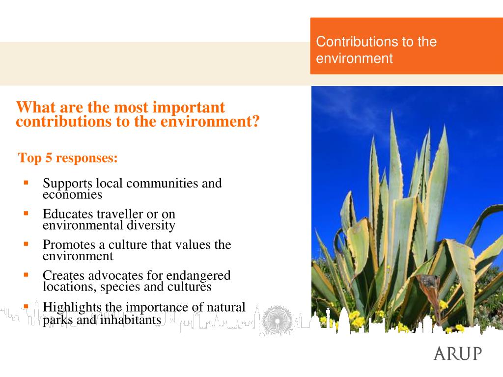 Contributions to the environment What are the most important contributions to the environment? Top 5 responses: • Supports local communities and economies • Educates traveller or on environmental diversity • Promotes a culture that values the environment • Creates advocates for endangered locations, species and cultures • Highlights the importance of natural parks and inhabitants