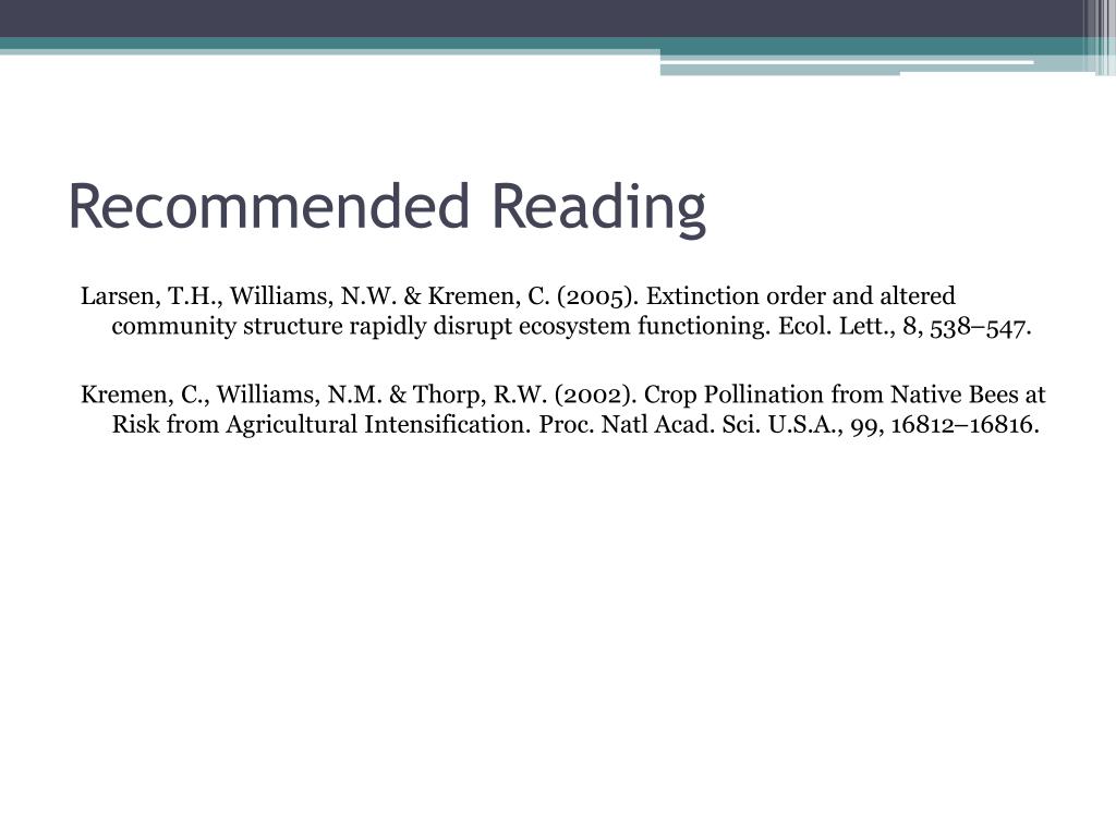 Recommended Reading Larsen, T.H., Williams, N.W. & Kremen, C. (2005). Extinction order and altered community structure rapidly disrupt ecosystem functioning. Ecol. Lett., 8, 538–547. Kremen, C., Williams, N.M. & Thorp, R.W. (2002). Crop Pollination from Native Bees at Risk from Agricultural Intensification. Proc. Natl Acad. Sci. U.S.A., 99, 16812–16816.