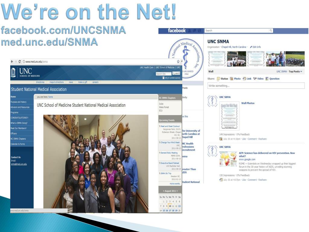 We Love Google!! • We use Google products quite often: • Gmail • Contact Jessica and Ayesha (presidents) jointly at uncsnma@gmail.com • Contact Luke and Brandon (HPREP) jointly at hprep.unc@gmail.com • Contact Indira and Mariatu (MAPS) jointly at uncsnmaquestions@gmail.com • GoogleCal: ALL of our events are posted to our Google calendar so you can find out what we have going on with just the touch of a button! • GoogleDocs: we love to get your input and feedback in the form of a GoogleDoc! It streamlines sign-ups and allows us be more efficient!
