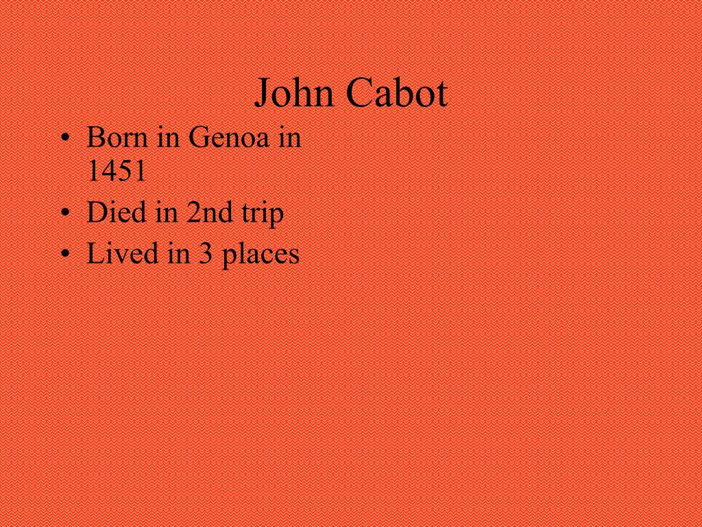 John Cabot • Born in Genoa in 1451 • Died in 2nd trip • Lived in 3 places