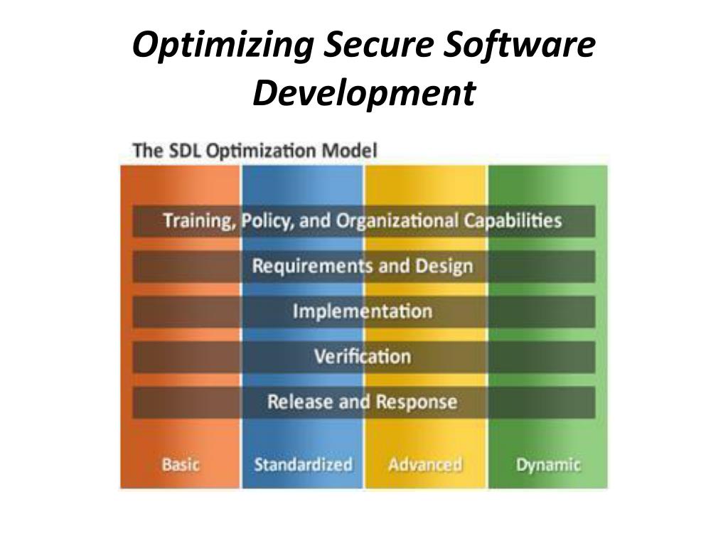 Security Development Lifecycle (SDL) • Trustworthy Computing – Directive issued by Bill Gates, January 2002. • Encapsulated “S3+C”: Security (and privacy) by design; Security (and privacy) by default; Security (and privacy) in deployment; Communications. • Set of policies, processes, tools, resources. • Example tool: SDL Process Template for VSTS.