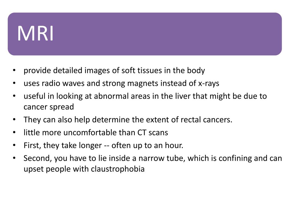 provide detailed images of soft tissues in the body • uses radio waves and strong magnets instead of x-rays • useful in looking at abnormal areas in the liver that might be due to cancer spread • They can also help determine the extent of rectal cancers. • little more uncomfortable than CT scans • First, they take longer -- often up to an hour. • Second, you have to lie inside a narrow tube, which is confining and can upset people with claustrophobia