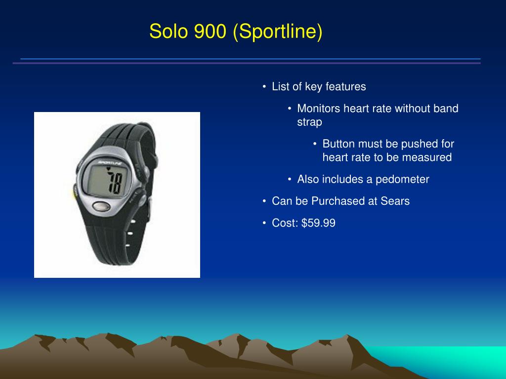 Solo 900 ( Sportline ). List of key features Monitors heart rate without band strap Button must be pushed for heart rate to be measured Also includes a pedometer Can be Purchased at Sears Cost: $59.99. Duo 1025. List of key features Monitors heart rate with and without band strap