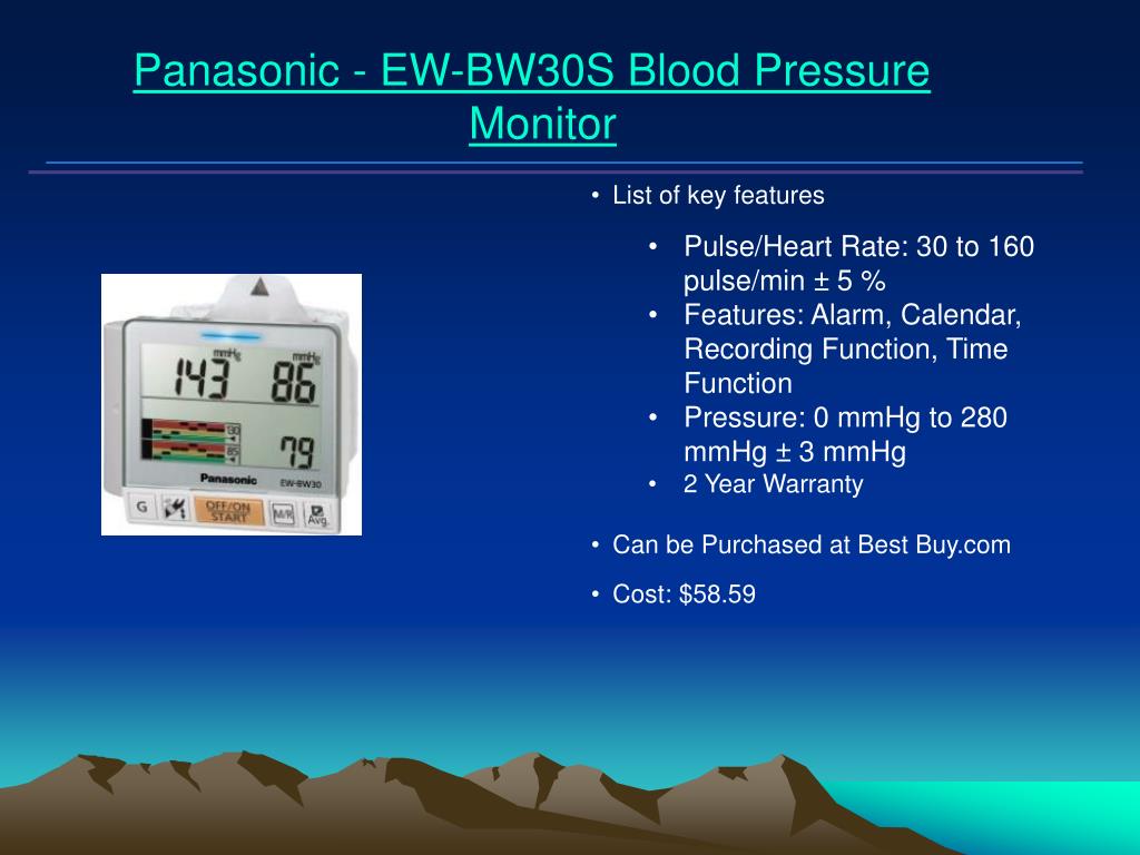 Panasonic - EW-BW30S Blood Pressure Monitor • List of key features • Pulse/Heart Rate: 30 to 160 pulse/min ± 5 % • Features: Alarm, Calendar, Recording Function, Time Function • Pressure: 0 mmHg to 280 mmHg ± 3 mmHg • 2 Year Warranty • Can be Purchased at Best Buy.com • Cost: $58.59