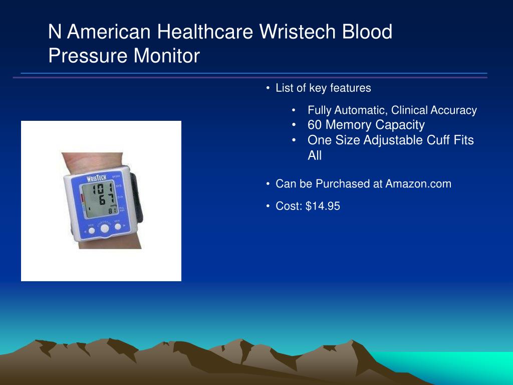 N American Healthcare Wristech Blood Pressure Monitor • List of key features • Fully Automatic, Clinical Accuracy • 60 Memory Capacity • One Size Adjustable Cuff Fits All • Can be Purchased at Amazon.com • Cost: $14.95
