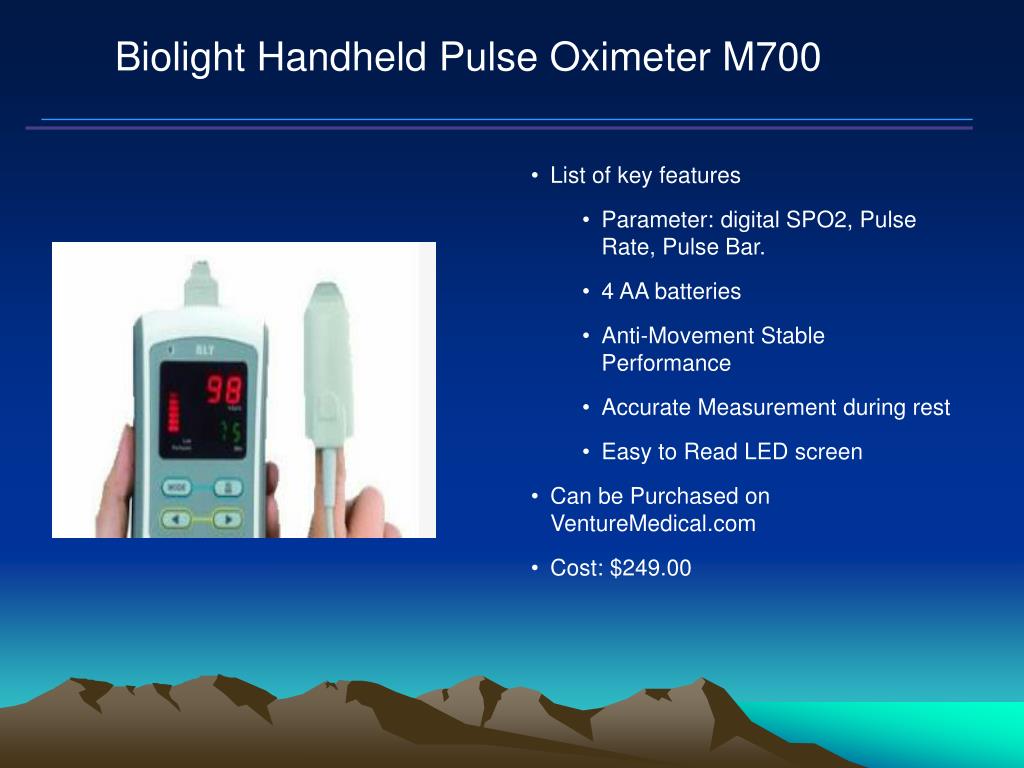 Biolight Handheld Pulse OximeterM700 • List of key features • Parameter: digital SPO2, Pulse Rate, Pulse Bar. • 4 AA batteries • Anti-Movement Stable Performance • Accurate Measurement during rest • Easy to Read LED screen • Can be Purchased on VentureMedical.com • Cost: $249.00