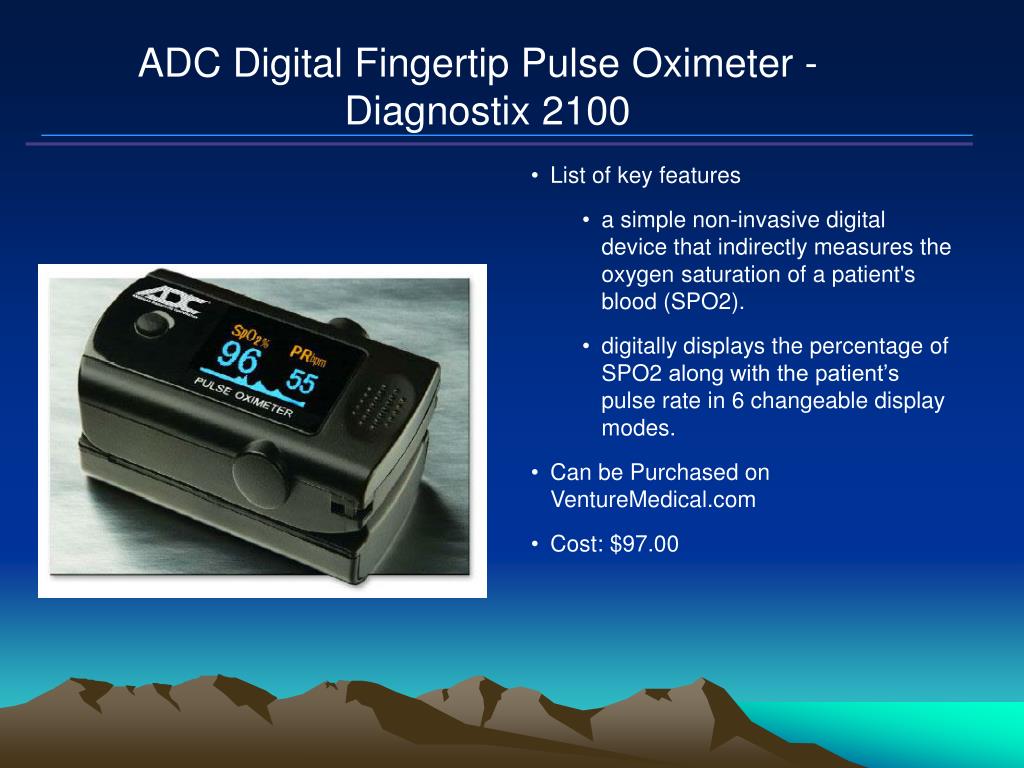 ADC Digital Fingertip Pulse Oximeter - Diagnostix 2100 • List of key features • a simple non-invasive digital device that indirectly measures the oxygen saturation of a patient's blood (SPO2). • digitally displays the percentage of SPO2 along with the patient’s pulse rate in 6 changeable display modes. • Can be Purchased on VentureMedical.com • Cost: $97.00