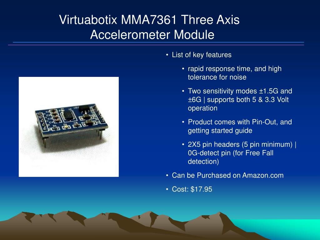 VirtuabotixMMA7361 Three Axis Accelerometer Module • List of key features • rapid response time, and high tolerance for noise • Two sensitivity modes ±1.5G and ±6G | supports both 5 & 3.3 Volt operation • Product comes with Pin-Out, and getting started guide • 2X5 pin headers (5 pin minimum) | 0G-detect pin (for Free Fall detection) • Can be Purchased on Amazon.com • Cost: $17.95