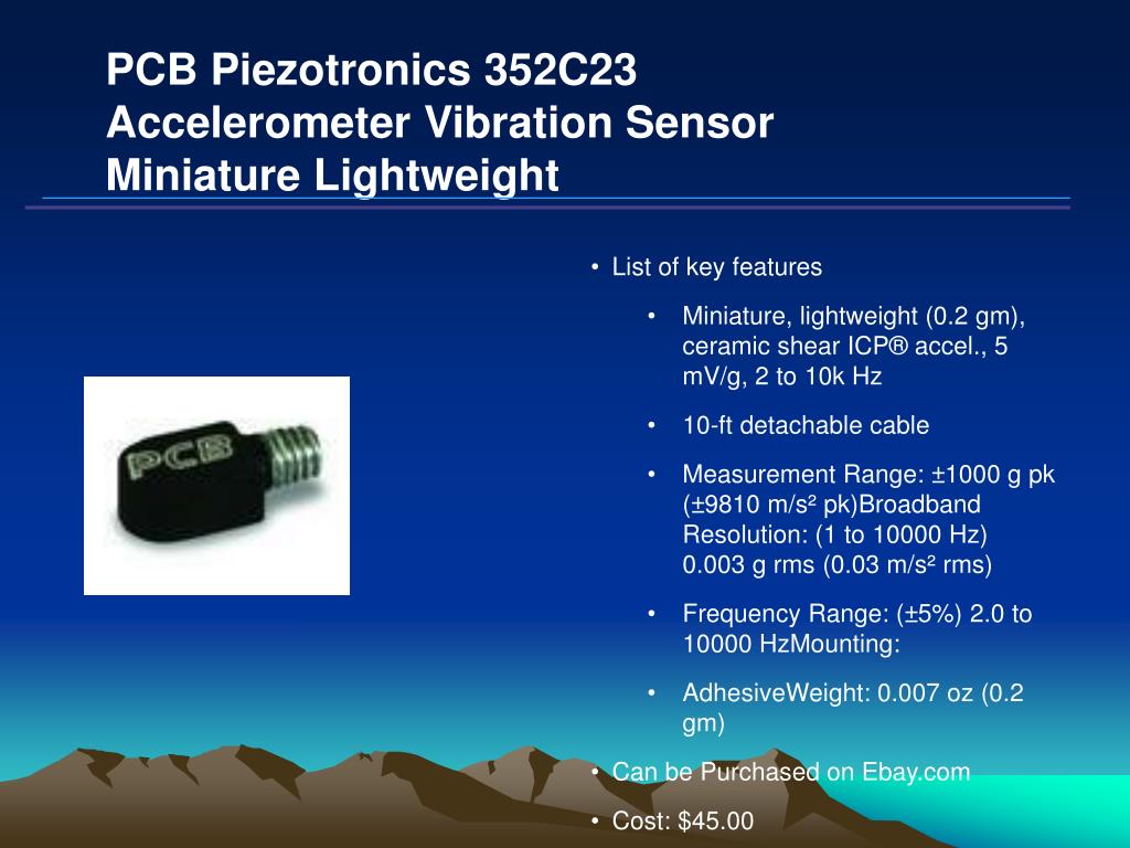 PCB Piezotronics352C23 Accelerometer Vibration Sensor Miniature Lightweight • List of key features • Miniature, lightweight (0.2 gm), ceramic shear ICP® accel., 5 mV/g, 2 to 10kHz • 10-ftdetachable cable • Measurement Range: ±1000 g pk (±9810 m/s²pk)Broadband Resolution: (1 to 10000 Hz) 0.003 g rms (0.03 m/s²rms) • Frequency Range: (±5%) 2.0 to 10000 HzMounting: • AdhesiveWeight: 0.007 oz (0.2 gm) • Can be Purchased on Ebay.com • Cost: $45.00