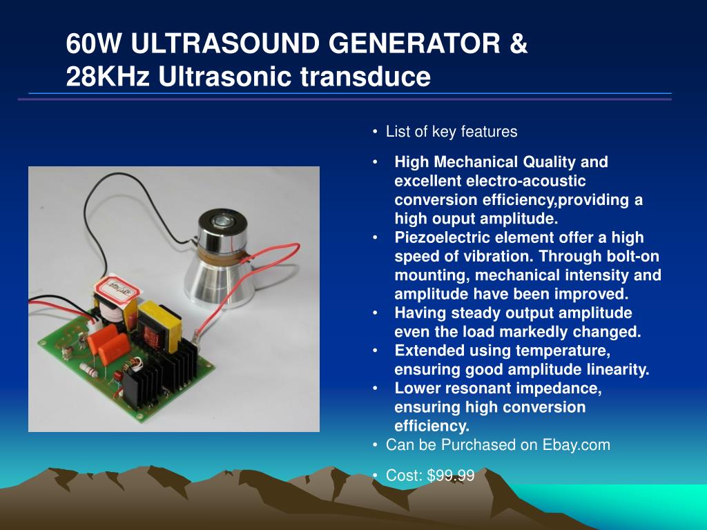 60WULTRASOUNDGENERATOR & 28KHzUltrasonictransduce • List of key features • High Mechanical Quality and excellent electro-acoustic conversion efficiency,providing a high ouput amplitude. • Piezoelectric element offer a high speed of vibration. Through bolt-on mounting, mechanical intensity and amplitude have been improved. • Having steady output amplitude even the load markedly changed. • Extended using temperature, ensuring good amplitude linearity. • Lower resonant impedance, ensuring high conversion efficiency. • Can be Purchased on Ebay.com • Cost: $99.99