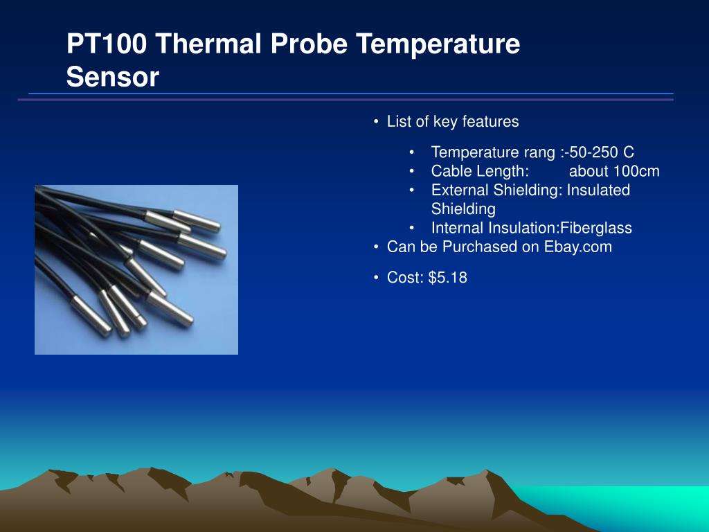 PT100 Thermal Probe Temperature Sensor • List of key features • Temperature rang :-50-250 C • Cable Length: about 100cm • External Shielding: Insulated Shielding • Internal Insulation:Fiberglass • Can be Purchased on Ebay.com • Cost: $5.18