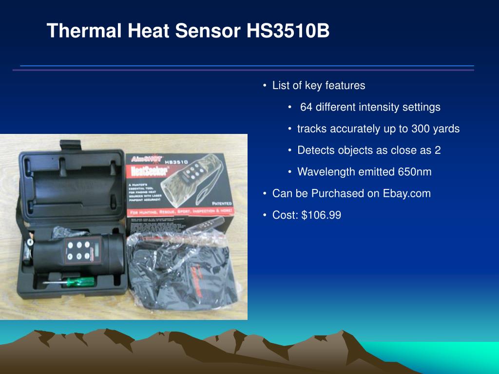 Thermal Heat Sensor HS3510B • List of key features • 64 different intensity settings • tracks accurately up to 300 yards • Detects objects as close as 2 • Wavelength emitted 650nm • Can be Purchased on Ebay.com • Cost: $106.99