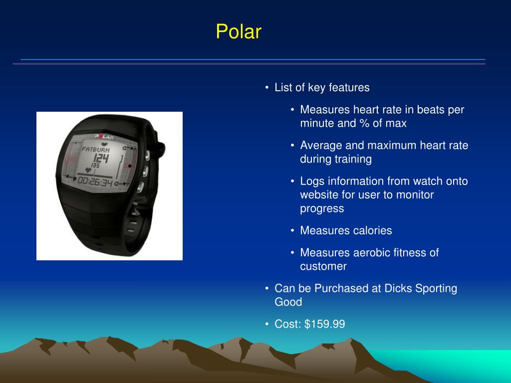 Polar • List of key features • Measures heart rate in beats per minute and % of max • Average and maximum heart rate during training • Logs information from watch onto website for user to monitor progress • Measures calories • Measures aerobic fitness of customer • Can be Purchased at Dicks Sporting Good • Cost: $159.99