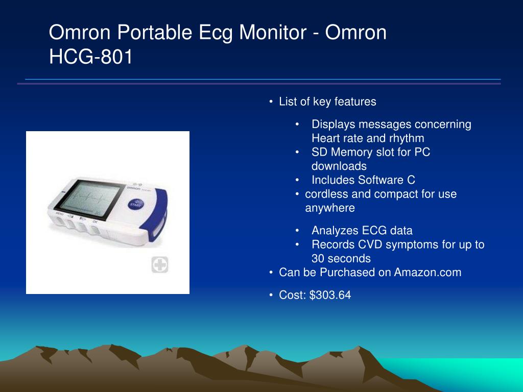 Omron Portable Ecg Monitor - Omron HCG-801 • List of key features • Displays messages concerning Heart rate and rhythm • SD Memory slot for PC downloads • Includes Software C • cordless and compact for use anywhere • Analyzes ECG data • Records CVD symptoms for up to 30 seconds • Can be Purchased on Amazon.com • Cost: $303.64