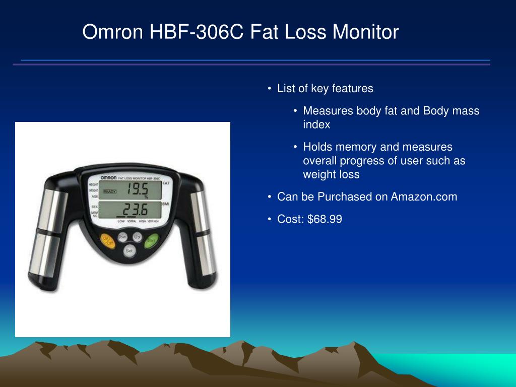 Omron HBF-306C Fat Loss Monitor • List of key features • Measures body fat and Body mass index • Holds memory and measures overall progress of user such as weight loss • Can be Purchased on Amazon.com • Cost: $68.99