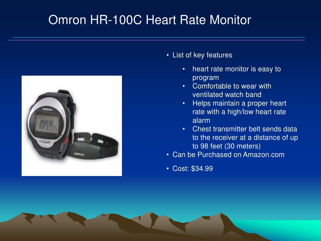 Omron HR-100C Heart Rate Monitor • List of key features • heart rate monitor is easy to program • Comfortable to wear with ventilated watch band • Helps maintain a proper heart rate with a high/low heart rate alarm • Chest transmitter belt sends data to the receiver at a distance of up to 98 feet (30 meters) • Can be Purchased on Amazon.com • Cost: $34.99
