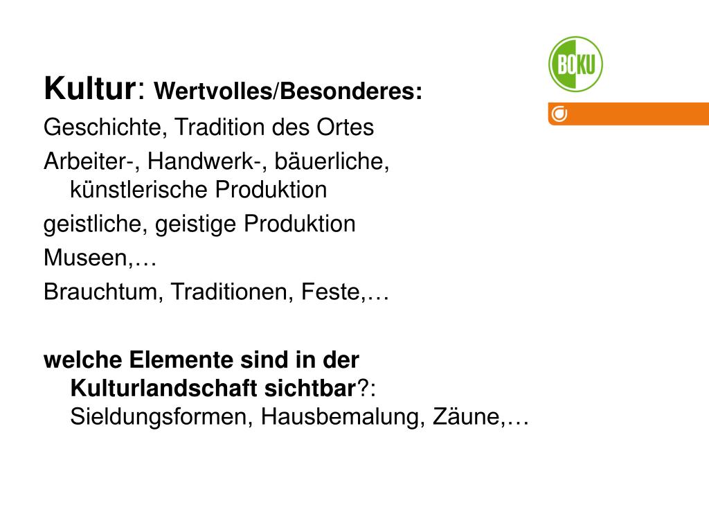 Kultur: Wertvolles/Besonderes: Geschichte, Tradition des Ortes Arbeiter-, Handwerk-, bäuerliche, künstlerische Produktion geistliche, geistige Produktion Museen,… Brauchtum, Traditionen, Feste,… welche Elemente sind in der Kulturlandschaft sichtbar?: Sieldungsformen, Hausbemalung, Zäune,…