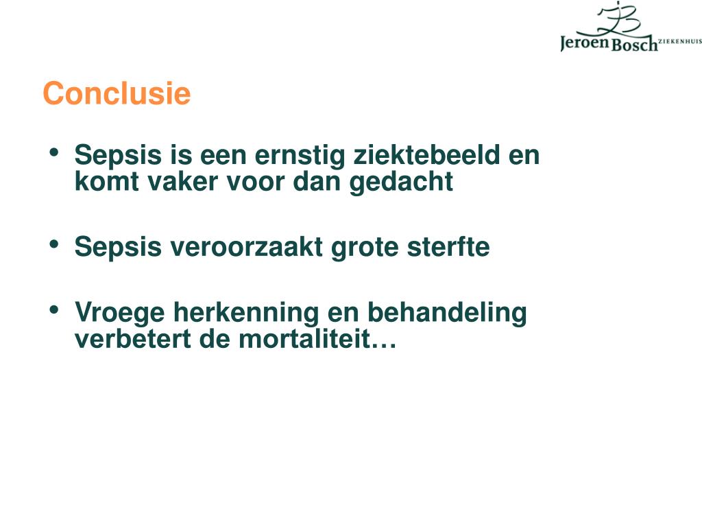 Conclusie • Sepsis is een ernstig ziektebeeld en komt vaker voor dan gedacht • Sepsis veroorzaakt grote sterfte • Vroege herkenning en behandeling verbetert de mortaliteit…