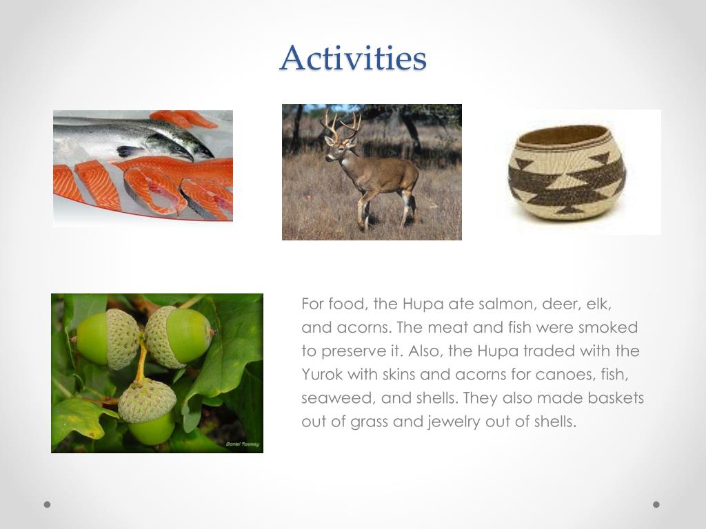 Activities For food, the Hupa ate salmon, deer, elk, and acorns. The meat and fish were smoked to preserve it. Also, the Hupa traded with the Yurok with skins and acorns for canoes, fish, seaweed, and shells. They also made baskets out of grass and jewelry out of shells.
