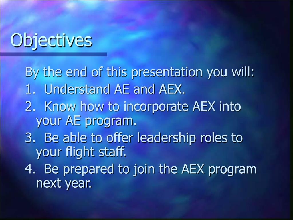 Objectives By the end of this presentation you will: 1. Understand AE and AEX. 2. Know how to incorporate AEX into your AE program. 3. Be able to offer leadership roles to your flight staff. 4. Be prepared to join the AEX program next year.