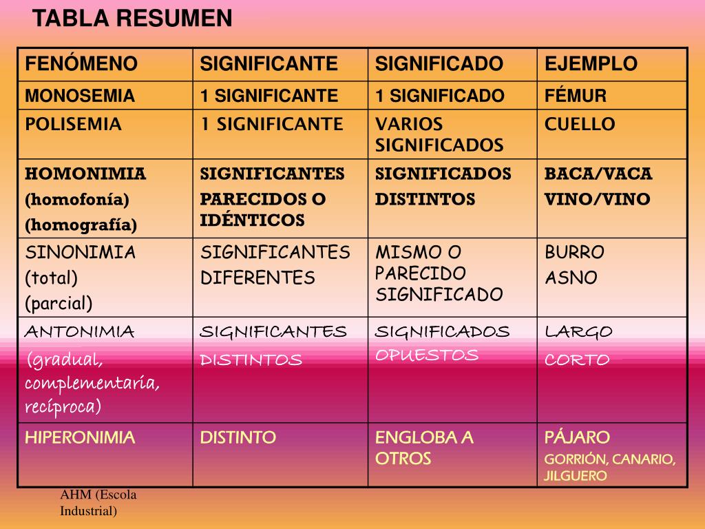 +Homonimia: No debe confundirse la homonimia con la polisemia. En caso de necesidad y habiendo dudas, hay que mirar en el diccionario. Generalmente las palabras polisémicas aparecen una sola vez con sus diferentes significados, mientras que las palabras homónimas aparecen con diferentes entradas. Se repite la palabra porque su etimología, origen, es diferente. Hiperonimia: fenómeno que consiste en que el significado de un término engloba el significado de otros. Los términos cuyo significado es más reducido se llaman hipónimos hiperónimo roedor ratón conejo ardilla hipónimos
