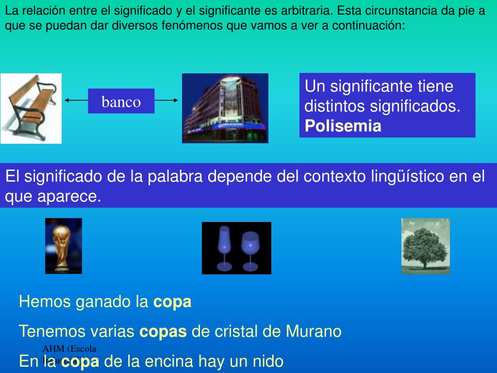 La relación entre el significado y el significante es arbitraria. Esta circunstancia da pie a que se puedan dar diversos fenómenos que vamos a ver a continuación: banco Un significante tiene distintos significados. Polisemia El significado de la palabra depende del contexto lingüístico en el que aparece. Hemos ganado la copa Tenemos varias copas de cristal de Murano En la copa de la encina hay un nido