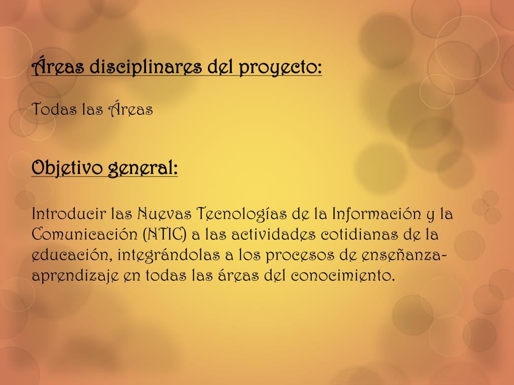 Áreas disciplinares del proyecto: Todas las Áreas Objetivo general: Introducir las Nuevas Tecnologías de la Información y la Comunicación (NTIC) a las actividades cotidianas de la educación, integrándolas a los procesos de enseñanza- aprendizaje en todas las áreas del conocimiento.