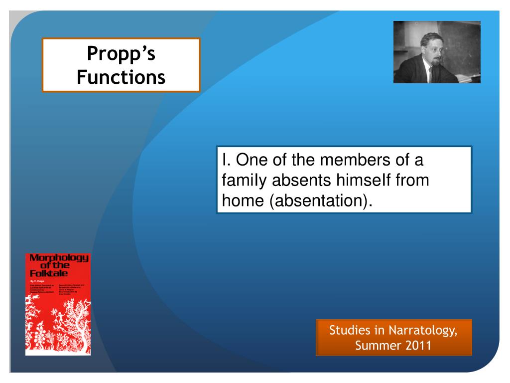 Vladimir Propp (1895-1970). Major Figures in Narratology. Studies in Narratology, Summer 2011. Propp’s Functions. I. One of the members of a famiIy absents himseIf from home ( absentation ). Studies in Narratology, Summer 2011. Propp’s Functions.