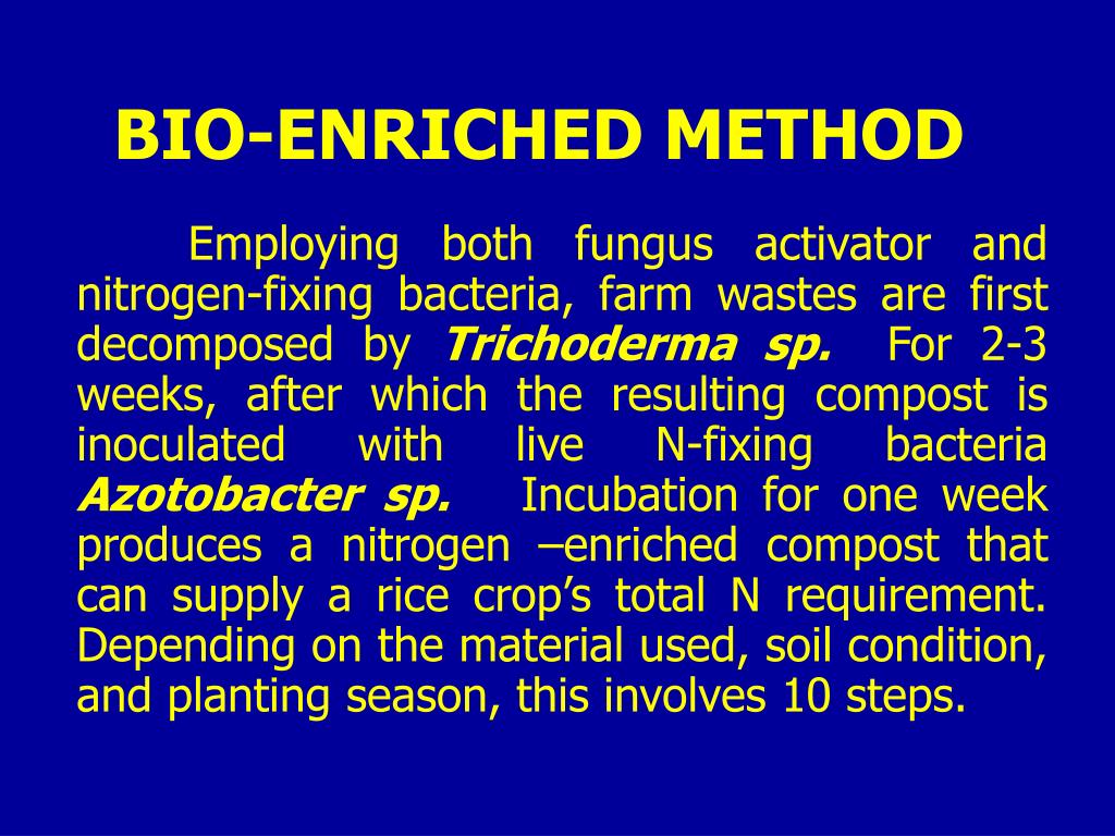 BIO-ENRICHED METHOD Employing both fungus activator and nitrogen-fixing bacteria, farm wastes are first decomposed by Trichoderma sp. For 2-3 weeks, after which the resulting compost is inoculated with live N-fixing bacteria Azotobacter sp. Incubation for one week produces a nitrogen –enriched compost that can supply a rice crop’s total N requirement. Depending on the material used, soil condition, and planting season, this involves 10 steps.