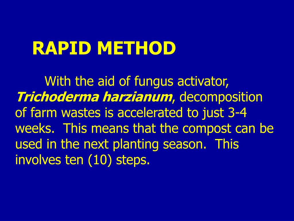 RAPID METHOD With the aid of fungus activator, Trichoderma harzianum, decomposition of farm wastes is accelerated to just 3-4 weeks. This means that the compost can be used in the next planting season. This involves ten (10) steps.
