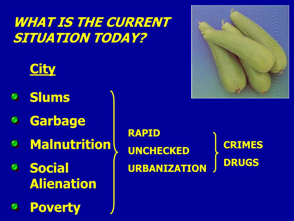URBAN AGRICULTURE. WHAT IS THE CURRENT SITUATION TODAY?. City. Slums Garbage Malnutrition Social Alienation Poverty. RAPID UNCHECKED URBANIZATION. CRIMES DRUGS. Family. Exorbitant Cost of Food Nutrition leached out of the produce