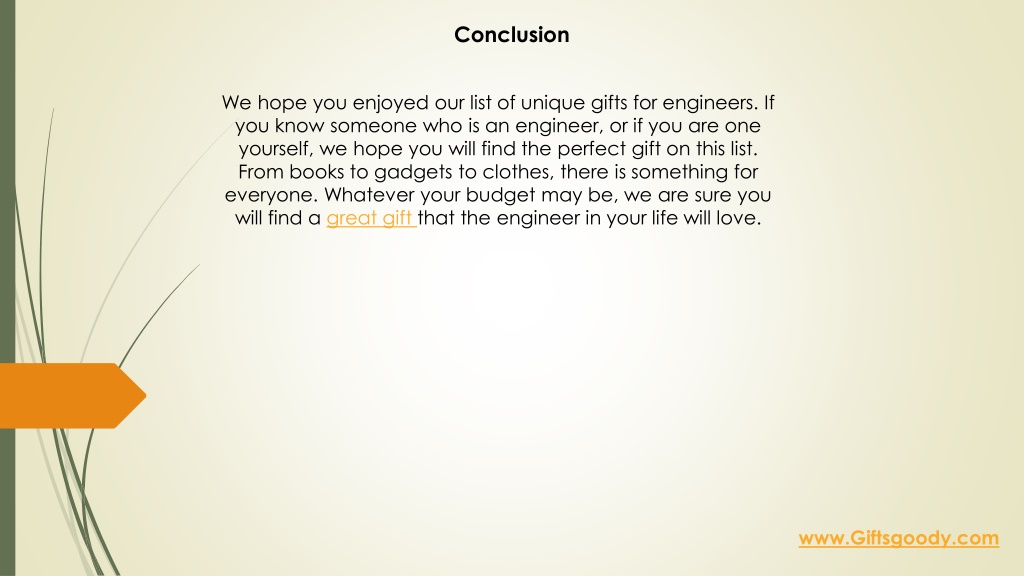 Conclusion We hope you enjoyed our list of unique gifts for engineers. If you know someone who is an engineer, or if you are one yourself, we hope you will find the perfect gift on this list. From books to gadgets to clothes, there is something for everyone. Whatever your budget may be, we are sure you will find a great gift that the engineer in your life will love. www.Giftsgoody.com