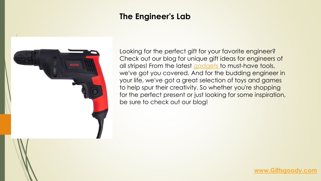 The Engineer's Lab Looking for the perfect gift for your favorite engineer? Check out our blog for unique gift ideas for engineers of all stripes! From the latest gadgets to must-have tools, we've got you covered. And for the budding engineer in your life, we've got a great selection of toys and games to help spur their creativity. So whether you're shopping for the perfect present or just looking for some inspiration, be sure to check out our blog! www.Giftsgoody.com