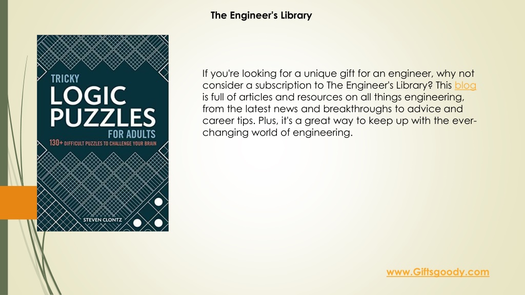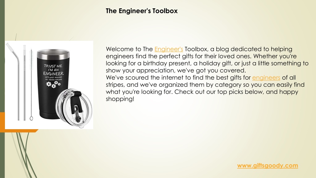 The Engineer's Library If you're looking for a unique gift for an engineer, why not consider a subscription to The Engineer's Library? This blog is full of articles and resources on all things engineering, from the latest news and breakthroughs to advice and career tips. Plus, it's a great way to keep up with the ever-changing world of engineering. www.Giftsgoody.com