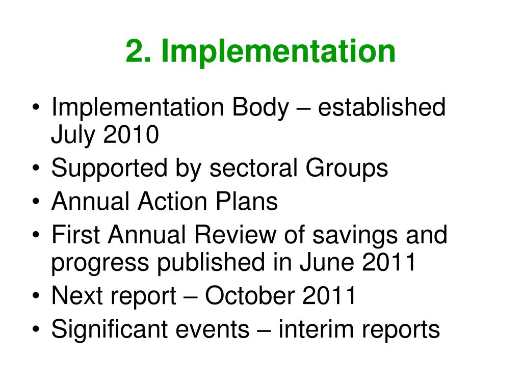 2. Implementation • Implementation Body – established July 2010 • Supported by sectoral Groups • Annual Action Plans • First Annual Review of savings and progress published in June 2011 • Next report – October 2011 • Significant events – interim reports