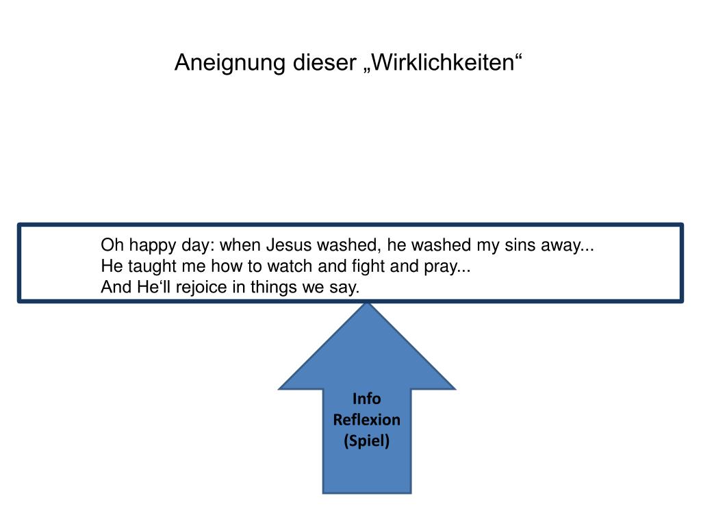 Aneignung dieser „Wirklichkeiten“ Oh happy day: when Jesus washed, he washed my sins away... He taught me how to watch and fight and pray... And He‘ll rejoice in things we say. Info Reflexion (Spiel)