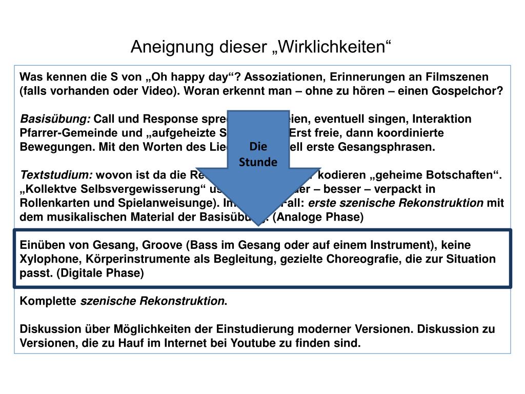 Aneignung dieser „Wirklichkeiten“ Was kennen die S von „Oh happy day“? Assoziationen, Erinnerungen an Filmszenen (falls vorhanden oder Video). Woran erkennt man – ohne zu hören – einen Gospelchor? Basisübung: Call und Response sprechen, schreien, eventuell singen, Interaktion Pfarrer-Gemeinde und „aufgeheizte Stimmung“. Erst freie, dann koordinierte Bewegungen. Mit den Worten des Liedes, eventuell erste Gesangsphrasen. Textstudium: wovon ist da die Rede? Afroamerikaner kodieren „geheime Botschaften“. „Kollektve Selbsvergewisserung“ usw. (explizit oder – besser – verpackt in Rollenkarten und Spielanweisunge). Im letzten Fall: erste szenische Rekonstruktion mit dem musikalischen Material der Basisübung. (Analoge Phase) Einüben von Gesang, Groove (Bass im Gesang oder auf einem Instrument), keine Xylophone, Körperinstrumente als Begleitung, gezielte Choreografie, die zur Situation passt. (Digitale Phase) Komplette szenische Rekonstruktion. Diskussion über Möglichkeiten der Einstudierung moderner Versionen. Diskussion zu Versionen, die zu Hauf im Internet bei Youtube zu finden sind. Die Stunde