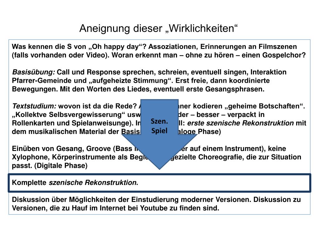 Aneignung dieser „Wirklichkeiten“ Was kennen die S von „Oh happy day“? Assoziationen, Erinnerungen an Filmszenen (falls vorhanden oder Video). Woran erkennt man – ohne zu hören – einen Gospelchor? Basisübung: Call und Response sprechen, schreien, eventuell singen, Interaktion Pfarrer-Gemeinde und „aufgeheizte Stimmung“. Erst freie, dann koordinierte Bewegungen. Mit den Worten des Liedes, eventuell erste Gesangsphrasen. Textstudium: wovon ist da die Rede? Afroamerikaner kodieren „geheime Botschaften“. „Kollektve Selbsvergewisserung“ usw. (explizit oder – besser – verpackt in Rollenkarten und Spielanweisunge). Im letzten Fall: erste szenische Rekonstruktion mit dem musikalischen Material der Basisübung. (Analoge Phase) Einüben von Gesang, Groove (Bass im Gesang oder auf einem Instrument), keine Xylophone, Körperinstrumente als Begleitung, gezielte Choreografie, die zur Situation passt. (Digitale Phase) Komplette szenische Rekonstruktion. Diskussion über Möglichkeiten der Einstudierung moderner Versionen. Diskussion zu Versionen, die zu Hauf im Internet bei Youtube zu finden sind. Szen. Spiel