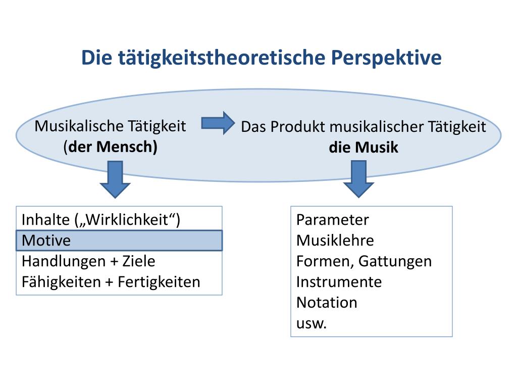 Die tätigkeitstheoretische Perspektive Musikalische Tätigkeit (der Mensch) Das Produkt musikalischer Tätigkeit die Musik Inhalte („Wirklichkeit“) Motive Handlungen + Ziele Fähigkeiten + Fertigkeiten Parameter Musiklehre Formen, Gattungen Instrumente Notation usw.