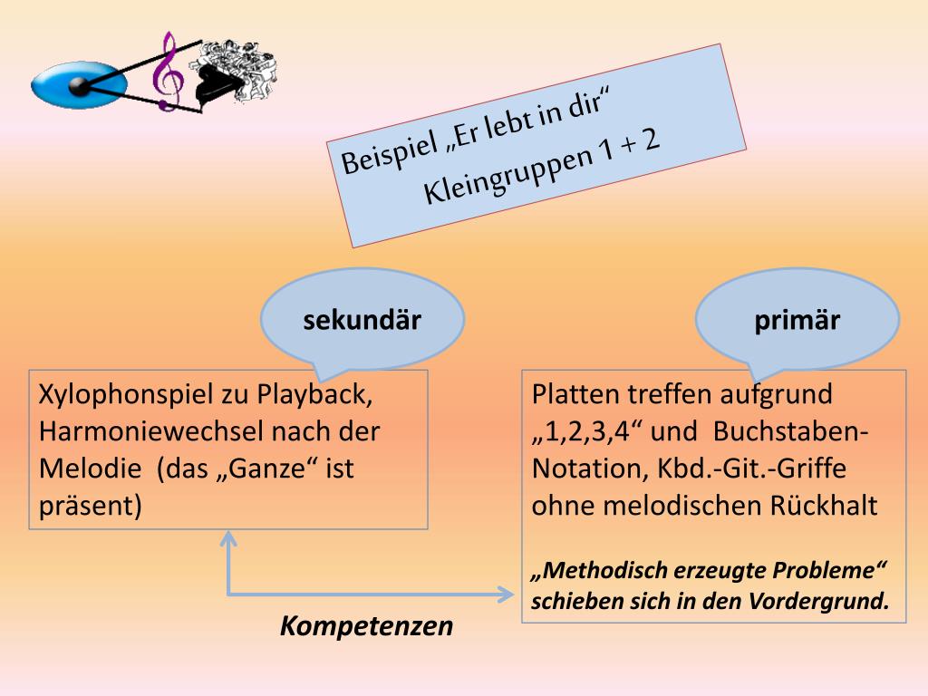 Beispiel „Er lebt in dir“ Kleingruppen 1 + 2 sekundär primär Xylophonspiel zu Playback, Harmoniewechsel nach der Melodie (das „Ganze“ ist präsent) Platten treffen aufgrund „1,2,3,4“ und Buchstaben-Notation, Kbd.-Git.-Griffe ohne melodischen Rückhalt „Methodisch erzeugte Probleme“ schieben sich in den Vordergrund. Kompetenzen