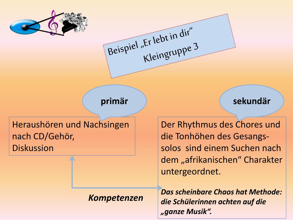 Beispiel „Er lebt in dir“ Kleingruppe 3 primär sekundär Heraushören und Nachsingen nach CD/Gehör, Diskussion Der Rhythmus des Chores und die Tonhöhen des Gesangs-solos sind einem Suchen nach dem „afrikanischen“ Charakter untergeordnet. Das scheinbare Chaos hat Methode: die Schülerinnen achten auf die „ganze Musik“. Kompetenzen