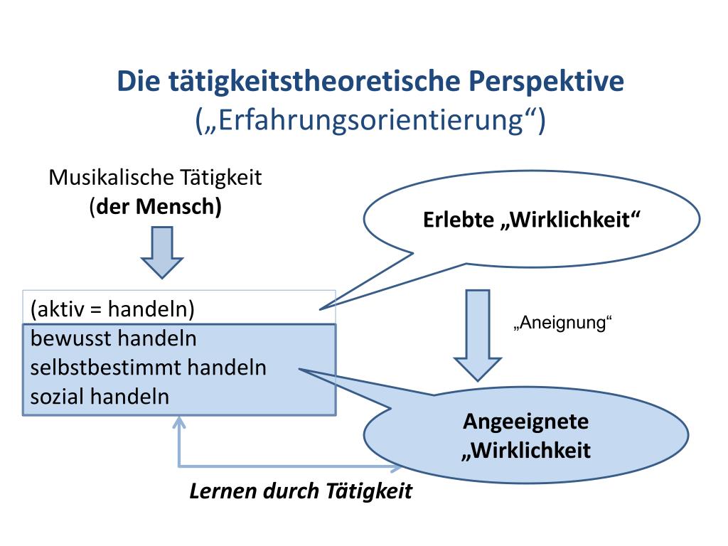 Die tätigkeitstheoretische Perspektive („Erfahrungsorientierung“) Musikalische Tätigkeit (der Mensch) Erlebte „Wirklichkeit“ (aktiv = handeln) bewusst handeln selbstbestimmt handeln sozial handeln „Aneignung“ Angeeignete „Wirklichkeit Lernen durch Tätigkeit