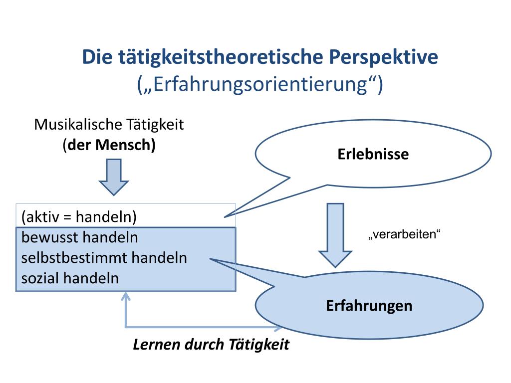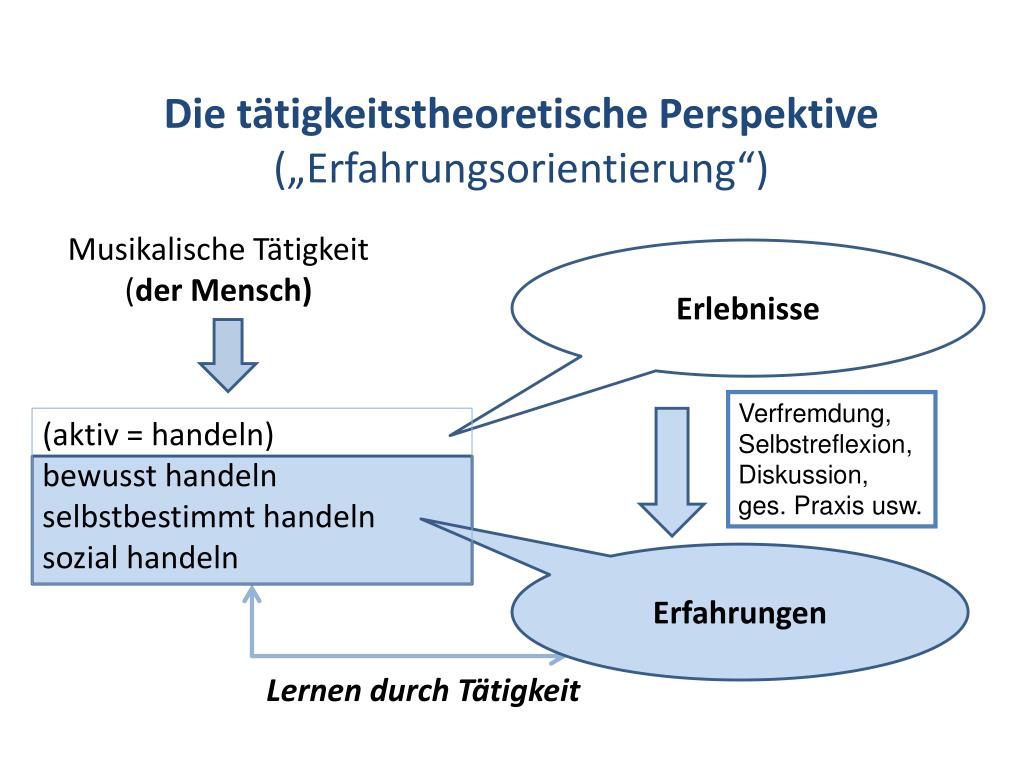 Die tätigkeitstheoretische Perspektive („Erfahrungsorientierung“) Musikalische Tätigkeit (der Mensch) Erlebnisse Verfremdung, Selbstreflexion, Diskussion, ges. Praxis usw. (aktiv = handeln) bewusst handeln selbstbestimmt handeln sozial handeln Erfahrungen Lernen durch Tätigkeit